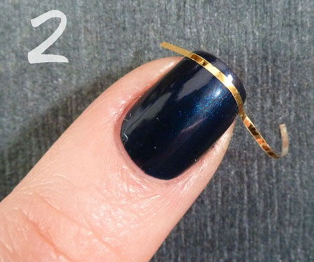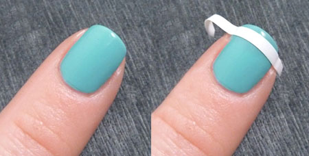 Шаг 3. Теперь приклейте кусочек канцелярского скотча ниже. Лучше, если толщина предполагаемых серебряных полосок будет одинаковая. Следите также за симметрией, чтобы на всех ногтях толщины были примерно одинаковыми, это будет смотреться более профессионально.