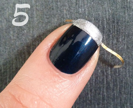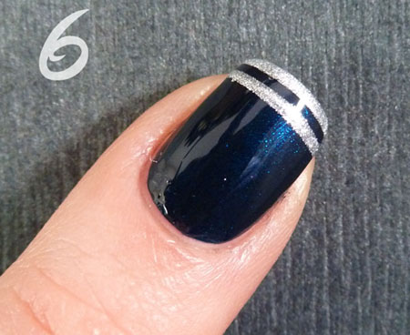Совет: делайте не сразу все ногти одной руки, а каждый ноготь по отдельности, чтобы скотч и серебряный лак не сильно присыхал, тогда полоса будет идеально ровной.