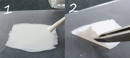 2. Ждем, пока высохнет, а потом аккуратно отделяем лак от целлофана. Должен отойти довольно легко. Пользуемся пинцетом.