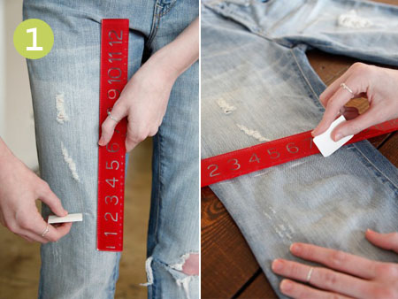 Шаг 1. Определитесь с нужной длиной, сделав отметку мелом на одной штанине. Сняв джинсы, прочертите линию отреза. Нужно положить линейку немного под углом. Так, чтобы внутренний шов был немного ниже внешнего.