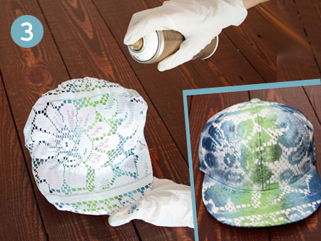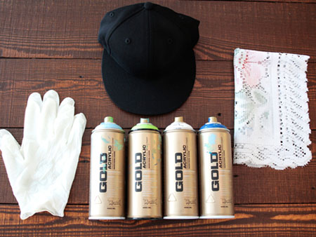 Для работы потребуется кусок старого тюля или кружевного полотна, несколько баллончиков с красками, черная бейсболка.