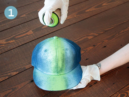Шаг 1. Покрасьте бейсболку по бокам самым темным цветом, который у вас есть (здесь – темно-синий). Затем по центру прокрасьте вторым цветом – более светлым (в нашем случае – светло-голубым). И более узкой полоской по центру прокрасьте третьим цветом (салатовым). Подождите, пока все три слоя высохнут.