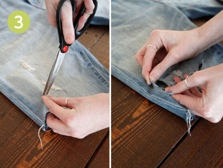 Шаг 3. Начинаем делать дырки. В случайном месте сделайте небольшой надрез ножницами. Дальше – рвите руками, потянув обеими руками в разные стороны. Повторите в тех местах, где хотите видеть дырки.