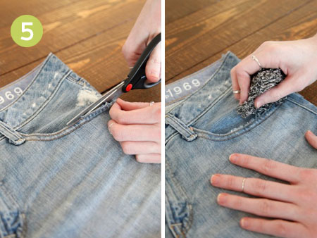 Шаг 5. Обработайте карманы. Сначала разрежьте верхний край (можно лезвием, можно - ножницами), а затем пройдитесь по краю металлической губкой, чтобы получилась бахрома.