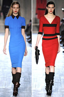 Любимый предмет творчества для Виктории – это, конечно, платья. Здесь она смела и даже несколько революционна. Она обыгрывает черной графикой любой яркий цвет. А для Осени-2012 предлагает красный и небесный, усмиряя эти чистые и яркие пятна своим излюбленным черным.