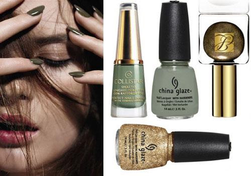 Среди болотно-песочных новинок стоит выделить, конечно, лаки для ногтей. Впервые в истории маникюра оттенки хаки стали трендовыми. Ногти цвета хаки – это, пожалуй, главная находка Осени. Ещё никогда не было так много камуфляжных оттенков в коллекциях лаков для ногтей. Если предыдущие лет пять законодателем в области лаков для ногтей был Chanel, то в этом сезоне первый раз за последние годы бренд Dior предложил сразу несколько новинок, ставших трендовыми и знаковыми на несколько сезонов вперед.