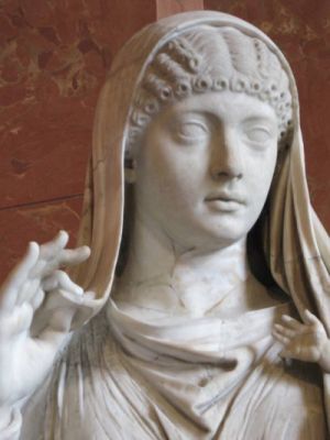 На сохранившемся изображении Мессалины Валерии - жены Клавдия волосы красавицы разделены вертикальными проборами, заплетены в мелкие косы и убраны на затылке.