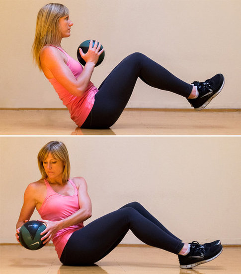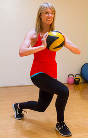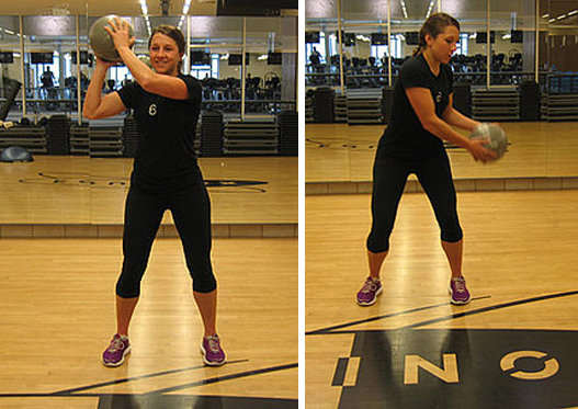 Включение в это упражнение набивного мяча добавляет силовой нагрузки. Упражнение хорошо для мышц ягодиц и бедер.