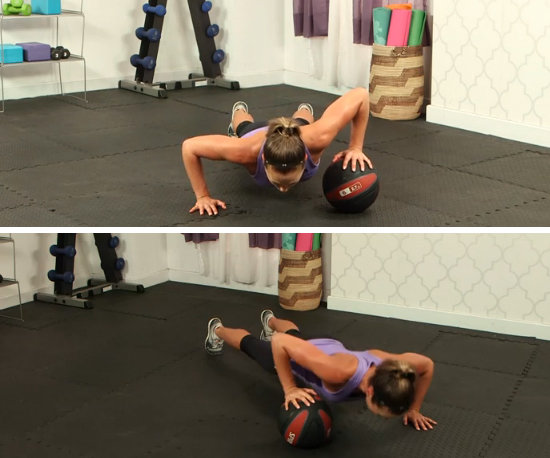 - Медицинский мяч положите у правой руки. Правой рукой обопритесь на мяч и сделайте одно отжимание.