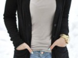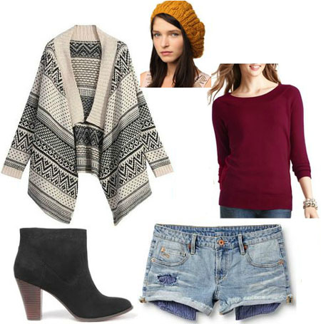 2. Джинсовые шорты. Не бойтесь летние шорты перенести в свой зимний гардероб. Под шорты наденьте пару теплых плотных колготок. Вверху – побольше теплого трикотажа: например, пуловер и кардиган. Ботильоны на устойчивом каблуке и берет добавят стиля.