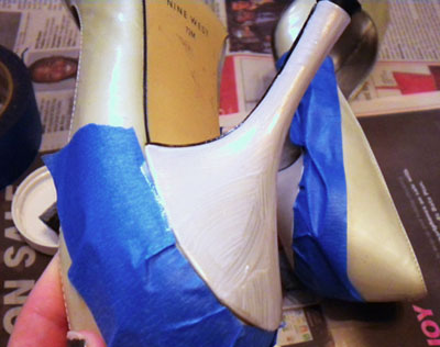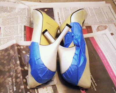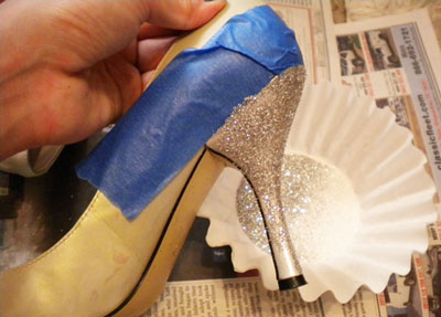 1. Заклейте скотчем ту часть туфель, которая должна остаться без блесток. Если делать блестящим каблук, то заклеить достаточно пятку туфель.