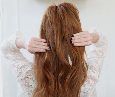 Предлагаем интересный и остроумный секрет. Лучше всего этот прием работает на волнистых волосах (если прямые, то можно завить), средних или длинных. Понадобятся также две резинки для волос. Шаг 1. Отделите волосы на верхней части головы. Соберите также прядки с боков за ушами. Закрепите стандартной резинкой в хвост. Шаг 2. Откиньте пока верхний хвост вперед... Читать полностью |