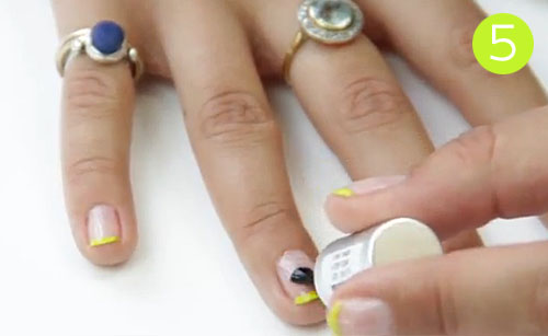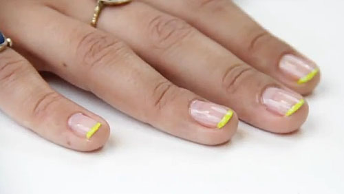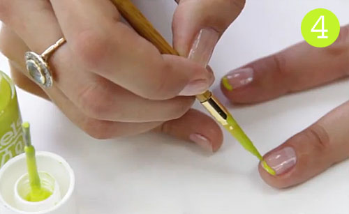Шаг 4. Тонкой кисточкой и неоновым оттенком лака (здесь оттенок лайм) нарисуйте линию по контуру каждого ногтя. При классическом французском маникюре используется скотч, но если есть навыки нейл-арта и хорошая кисточка, то вы сможете нарисовать ровную линию и без скотча.
