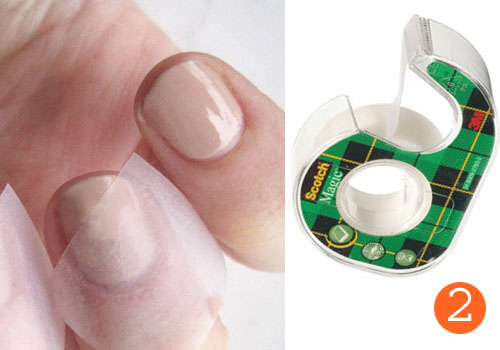 Шаг 2. Нанесите кусочек скотча не по прямой, как это делается при классическом французском маникюре, а по диагонали.