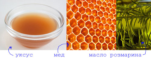Мед усиливает блеск и действует как натуральный увлажнитель. Эфирное масло розмарина придает блеск и удаляет перхоть. Уксус помогает запечатать фолликулы волос, увеличивает блеск, удаляет загрязнения. Яблочный уксус также разрушает вредные вещества, осевшие на волосах, он эффективен после воздействия хлора, хорошо его вымывает, поэтому после посещения бассейна рецепты с уксусом полезны.