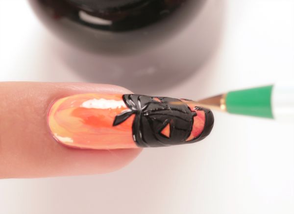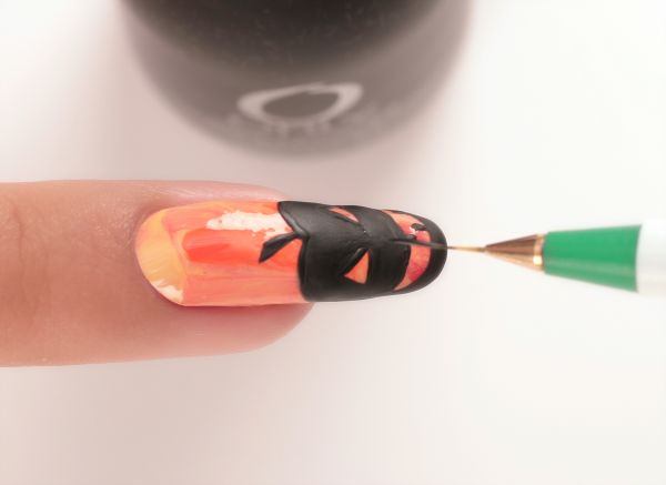 5. Главный элемент дизайна выполните кистью «Короткий волосок» и черным матовым лаком Matte Vinyl (№ 40242). Аккуратно прорисуйте контур тыквы.