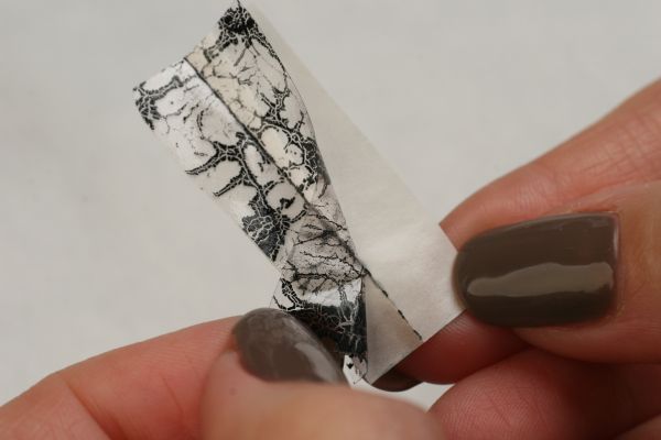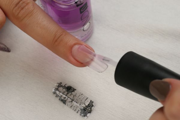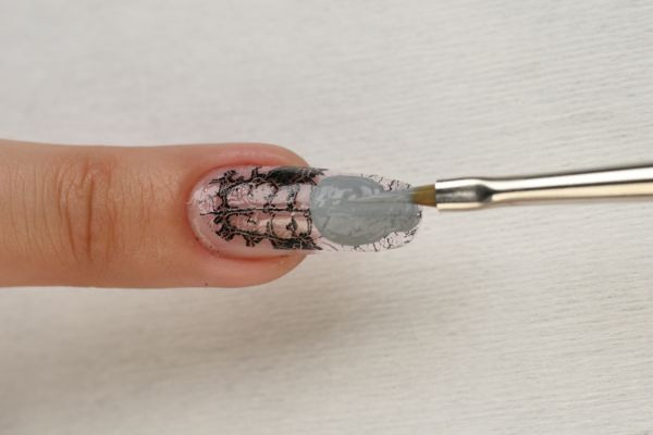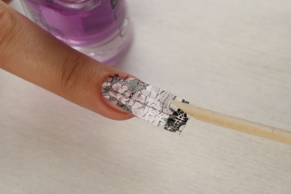 5. С помощью апельсиновой палочки, не спеша, уложите пленку с узором на невысохший ноготь. Разровняйте.