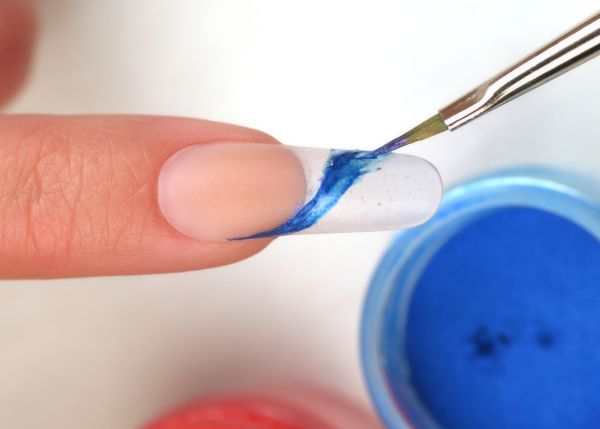 Шаг 1. Моделируем ноготь и подготавливаем его для дизайна. Смочив кисть «Кинжалообразная» в ликвиде, а затем набрав на нее пигмент Pigment Effect – Cerulean Blue от CND, наносим его диагональной волнистой линией.