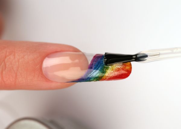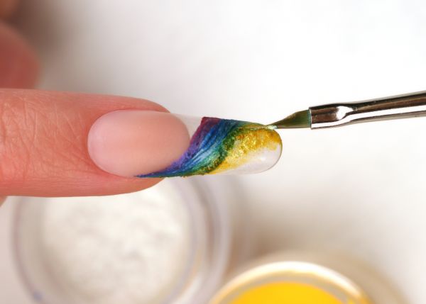 Шаг 2. Делаем перетяжку с плавными переходами от цвета к цвету. Используем пигменты от CND: Pigment Effect – Haute Pink, Effect – Medium Green, Pigment – Yellow.