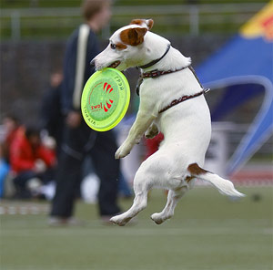 • Фрисби. Словом «фрисби» называют все виды активности с летающей тарелкой. Но, согласитесь, у современных занятых людей не всегда есть возможность иметь компаньона или даже целую команду компаньонов для совместной игры с летающей тарелкой. Собака же не требует составления особого расписания. С ней можно выходить погулять тогда, когда у вас есть свободное время. Фрисби с собакой сейчас очень популярно у худеющих: между прочим, можно сжечь около 100 калорий всего за 30 минут игры. Специальных правил для любительского фрисби не существует, надо просто максимально задействовать «тарелку» в своих играх с собакой: ловить, бросать, бегать. Хотя есть и соревнования для более продвинутых хозяев и собак.