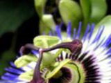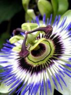 Они состоят из пяти узких чашелистиков с шиловидными выростами и фиолетовым венчиком из пяти свободных лепестков и бахромчатого двухслойного коронновидного образования из слегка волнистых нитей тоже фиолетового цвета с ярко окрашенными кончиками. Цветёт пассифлора всё лето.