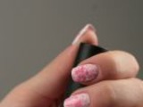 Игривости благородному белому оттенку добавит яркий розовый цвет Gotcha #116. Наносим лак необычным способом: берем скомканный целлофановый пакет и обмакиваем в лак, предварительно нанесенный на палитру. После этого наносим его на подсохшее белое покрытие.