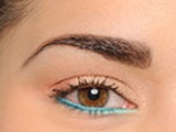Шаг 4. Нижняя линия роста ресниц. Сначала на неё нанести гелевый лайнер бирюзового оттенка (над ресницами и под ресницами). На внутренний уголок глаза (примерно на одну треть) нанести более светлый оттенок лайнера, чтобы макияж был не таким однообразным.
