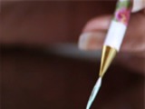 Шаг 3. Возьмите голубой оттенок лака и тонкой кисточкой нарисуйте штрихи по ногтевой пластине. Не стремитесь к совершенству: полоски могут быть разной длины и толщины. Главное – чтобы придерживаться одного направления: либо поперек ногтя, либо вдоль. Один или два ногтя могут выделяться и иметь отличное от остальных направление штрихов.