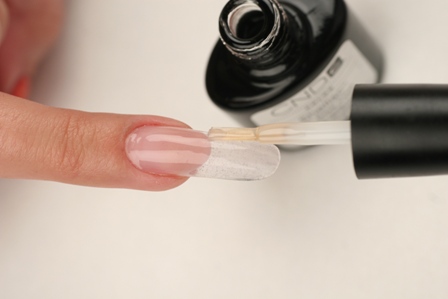 1. На подготовленный ноготь наносим базовое средство CND Shellac Base Coat и полимеризуем в UV-лампе CND в течение 10 секунд.