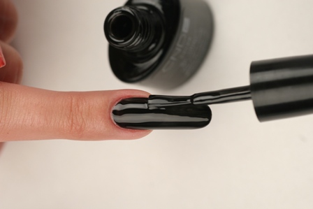 2. Покрываем ноготь гибридом лака и геля черного цвета CND Shellac Color Coat – Black Pool. Полимеризуем в UV-лампе CND в течение 2-х минут.