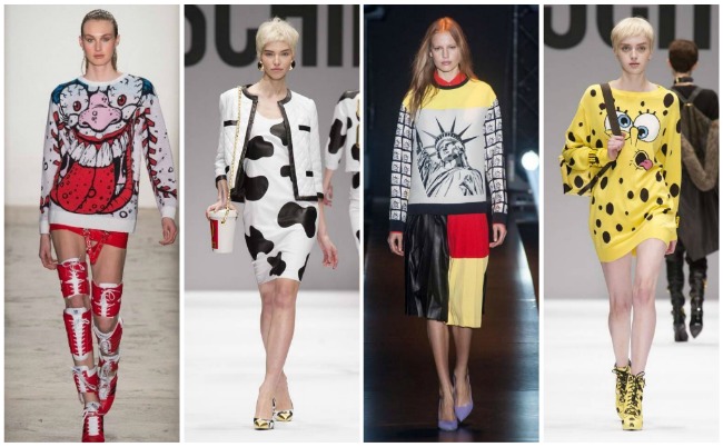 Наступающая зима, кроме всего прочего – и раздолье для тех, кто любит забавные и нескучные рисунки на одежде. Думаете, носить майку с Губкой Бобом можно лишь подросткам? Не тут-то было! Теплое платье с мультяшным героем для вполне взрослых девушек предлагает бренд Moschino. Он же создал платье, напоминающее нам конфету «Коровка». Red Valentino предлагает и других ярких мультяшек. А Fausto Puglisi обыграл в своем наряде Статую Свободы.