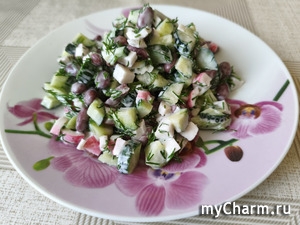 Всем добрый день!Нашла новый рецепт салатика с крабовыми палочками. Приготовила его, понравился. Делюсь с вами фоткой, по которой вам станет ясно, что в него входит. Делала его несколько раз - быстро и вкусно. Думаю, смело можно добавить в него кукурузу. Заправляла постным майонезом.