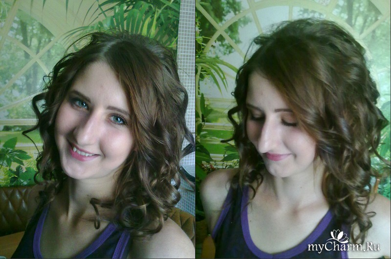 Моем волосы,сушим. На волосы наносим термозащиту,чтобы избежать повреждения волос. Затем,делим волосы на части и начинаем крутить. Как я уже говорила,такие локоны можно сделать как конусной плойкой,так и обычным утюжком для волос. Каждый слой локонов фиксируем лаком. У модели волосы покрыты лаком,а на фото которое я прикрепила(делала укладку утюжком) волосы не покрыты лаком.