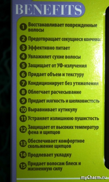 Её можно применять на влажные волосы и на сухие. В любом случае сразу будет заметно действие. Я чаще использую её на полностью высохшие локоны после мытья головы. Она компенсирует кондиционер, добавляет мягкости и упругости, увлажняет, устраняет пушистость и непослушность, придает блеск и жизненный вид. Кроме того, состав включает УФ-фильтры и рекомендован в качестве термозащиты при укладке феном, щипцами или утюжком. Отличная помощь для окрашенных и ослабленных волос.
