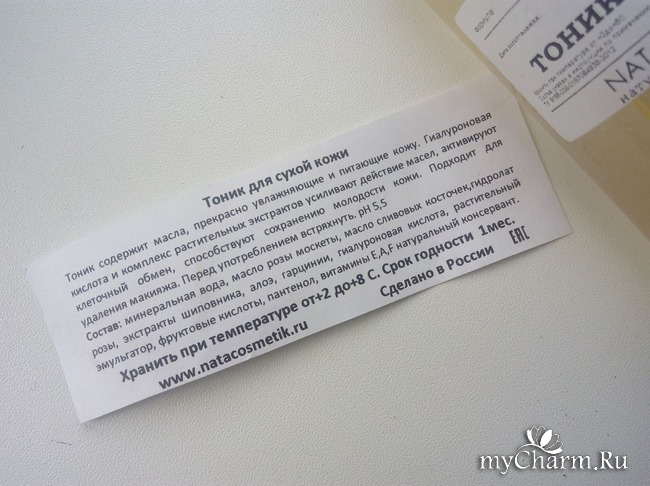 Собственно, последний аспект указан на бумажном буклете, который приложен к флакону с тоником. На нем же можно найти действие тоника, состав, срок годности и прочую важную информацию. Срок годности, кстати, всего один месяц, но эти и не удивляет, ведь в составе нет химических консервантов. Хранить тоник необходимо в холодильнике.