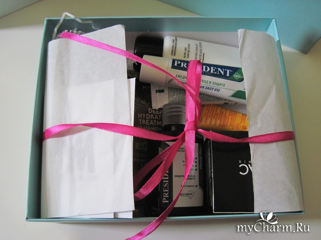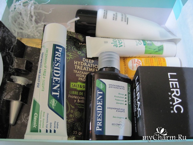 Помимо французских в коробочке также есть канадское масло для волос, два абсолютно не лишних продукта для красоты и здоровья зубов «PresiDENT» и два пробника экодекоративки Kristall Minerals – пудры и теней.