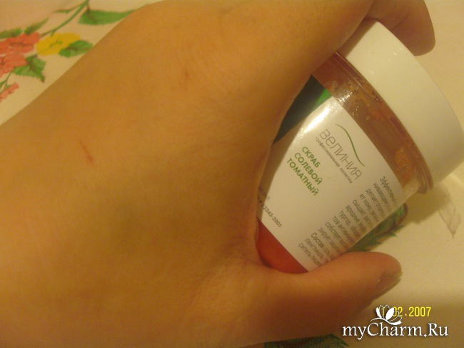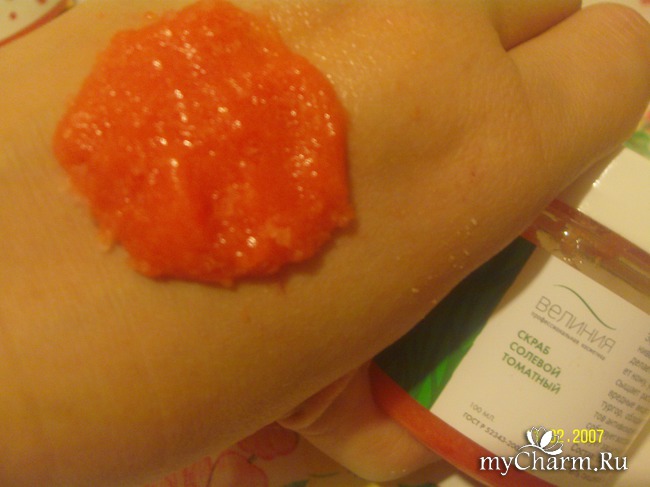 Мои выводы. Сказать, что я люблю скрабы – не сказать ничего! «Заразила» меня этим занятием еще одна моя подруга-чармелька – Ирина Корсакова, именно у нее я научилась немного разбираться в богатом ассортименте средств по уходу за кожей. Солевой томатный скраб от «Велинии» ей, думаю, не совсем бы понравился, так как, насколько я помню, Ирина предпочитает более жесткое действие. Но как вариант скраба для чувствительной кожи, данный продукт вполне может существовать, я думаю. Его можно использовать, как средство для нежных участков вашей кожи, например, для зоны шеи и декольте, для кожи рук. Впечатлил и натуральный состав продукта, что тоже немаловажно. Резюмируя обзор, могу сказать, что солевым томатным скрабом от «Велинии» я вполне довольна и смело могу рекомендовать его к использованию!