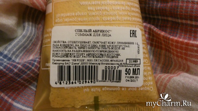Завершил мои сомнения и размышления взгляд на упаковку, где по-английски написано «Apricot Fruity Scrub». Почему же тогда русский перевод гласит, что это гоммаж? Это осталось для меня тайной. Но в любом случае, я осталась не обижена: скраб довольно нежный (несмотря на наличие грубых частиц), кожу не поцарапал, покраснения не вызвал, черные точки немного посветлели (полностью их убрать, думаю, никакому средству не под силу – механический был и остается самым действенным способом). Единственное, что мне не понравилось, так это то, что кожа после абрикосового скраба осталась немного стянутой и сухой. Под рукой она была нежной, но мимика дала знать, что кожа в неестественном состоянии. Сразу нанесла крем – и неприятные ощущения пропали без следа.