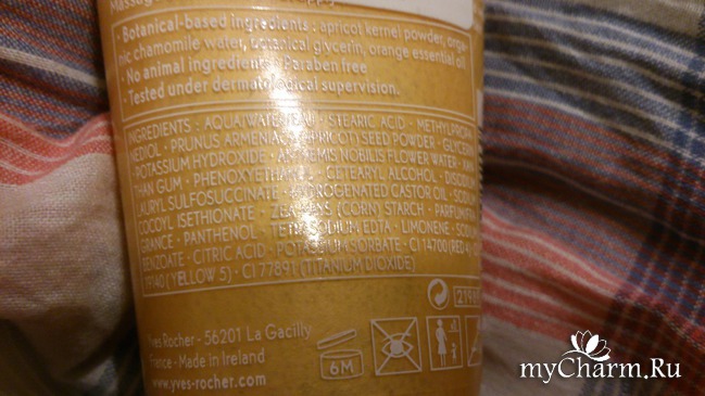 Аромат оказался приятным – сладковатым, нежным и, конечно, абрикосовым. Но вот само средство вызвало вопросы: частички для скрабирования кожи были очень крупные – на пудру не похоже. Я не любительница жестких скрабов, царапающих лицо и оставляющих красноту после себя, поэтому немного забеспокоилась. Кроме того, меня немного удивило наличие столь крупных частиц – все-таки в гоммаже они должны быть совсем мелкими, а массировать лицо не нужно (правильный гоммаж содержит фруктовые кислоты, которые химическим путем снимают ороговевшие клетки, а затем его нужно просто скатать с лица). Со скрабами дело другое – их наносят чаще всего на влажную кожу, массируют лицо, а затем смывают водой. Т. е. по всем признакам в моих руках находится скраб, а не гоммаж!