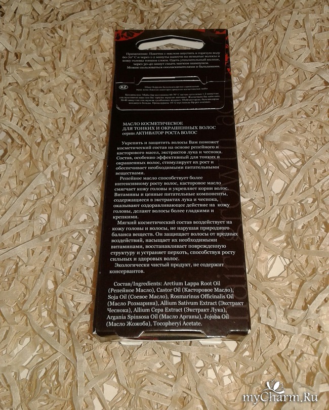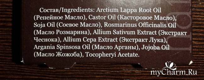 А в составе у Активатора... одни полезности! Тут и репейное масло, и касторовое, и соевое. Имеется масло Розмарина, Масло Жожоба, и даже масло Арганы! Хоть оно и значится на предпоследнем месте, но уже сам факт его присутствия не может не порадовать. Экстракты лука и чеснока дополняют состав, ну а замыкает список ингредиент, под названием Токоферола ацетат (он же витамин Е).