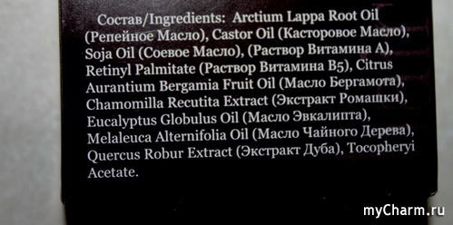 Скажу сразу, что состав средства восхитил. Это перечень, включающий сплошь масла, витаминки и экстракты. Мои любимые – это репейное масло, экстракт дуба и масло чайного дерева. Именно с ними я знакома лучше всего в своих домашних уходовых мероприятиях. Ну, а расширенный список стал еще большим плюсом.
