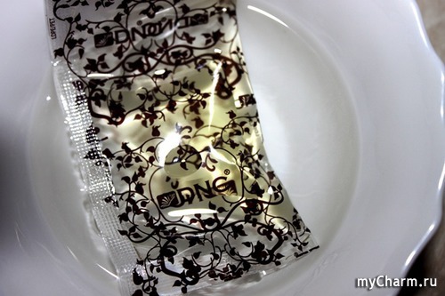 Аккуратно вскрываем и извлекаем запаянный брендовый пакетик с маслом. Его нужно опустить на пару минут в горячую воду (примерно 60С). Затем достаем и надрезаем уголок пакетика.
