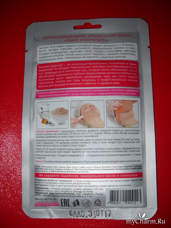 Производитель рекомендует нанести под маску сыворотку SHARY, уверяя, что альгинат способен в несколько раз усилить ее действие. Несмотря на то, что такая сыворотка у меня была, я этого делать не стала – уж очень хотелось сначала испытать маску без каких-либо дополнительных средств.