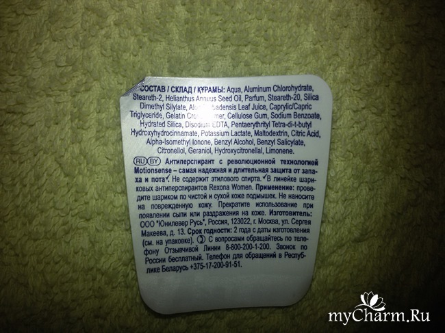 Компоненты в составе ни чем особенным не отличаются: после воды идет Aluminum Chlorohydrate и Steareth-2, которые часто можно встретить в первых ролях у антиперспирантах. Приятно, что уже на третьем месте значится что-то натуральное, а именно – масло семян подсолнечника. Экстракт листьев алоэ вера – на седьмом месте, что тоже неплохо.