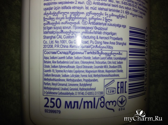 Это одна из первых фраз, которая значится на обороте упаковки. То ли раньше так не писали, то ли я не обращала внимание на такой нюанс, но на этот раз я была удивлена такому парадоксу. Однако прислушалась и поставила рядом с антибактериальным средством флакон обычного мыла.В составе мыла значатся обычные для антибактериальных средств компоненты, типа магнезия нитрата и магнезия хлорида. Но сразу же в глаза бросаются парабены - метилпарабен и пропилпарабен. Проще говоря, химии в мыле предостаточно. Единственные плюсы - сок алоэ вера на шестом месте (среди 34 компонентов) и уровень pH - 5,3 - близкий к нейтральному.