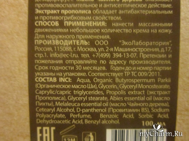 У крема натуральные ингредиенты растительного происхождения 98,5%. Производитель пишет, что претензии и пожелания можно отправить по адресу. Здорово же! Срок годности 30 месяцев.