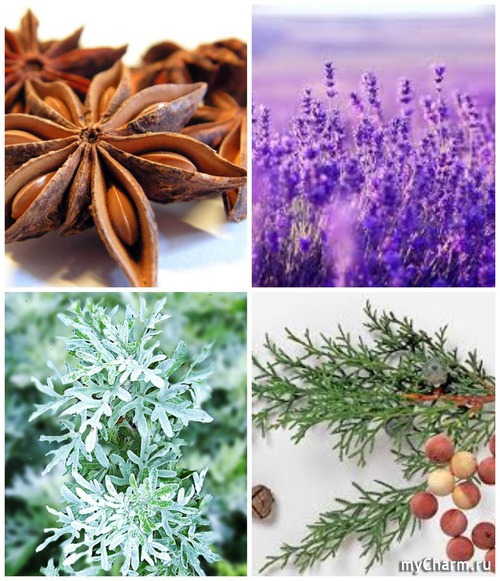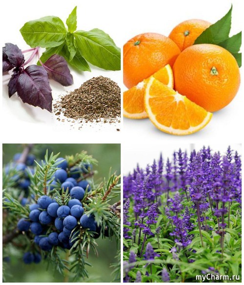 Эфирное масло Кедра, Лаванды, Полыни, Аниса, Кедра, Туи, Мяты, Иланга, Можжевельника, Туи, Базилика, Шалфея, Апельсина.