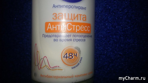 Этикетка антиперспиранта Nivea «Защита от стресса» выполнена в фирменном стиле и с громкими обещаниями решить проблему пота даже в условиях стресса аж на 48 часов. Ох, уж этот мне максимализм! На моей практике пока ни один дезодорантов с пометкой «48 часов» не справился с обещаниями.