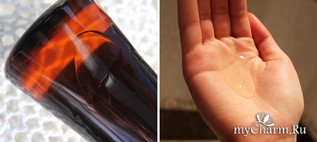 На фото, конечно, так этого не видно, потому что пока я вертелась с фотоаппаратом, капелька начала потихоньку съезжать, но поверьте мне на слово! Консистенция очень необычная для шампуня! Ты переворачиваешь бутылек, а тебе на ладошку выползает такой ароматный (ну очень вкусно и натурально пахнет) апельсиновый слизнячок! :) В общем, средство более густое, чем мы привыкли видеть, однако никаких проблем из-за этого у меня не возникало.