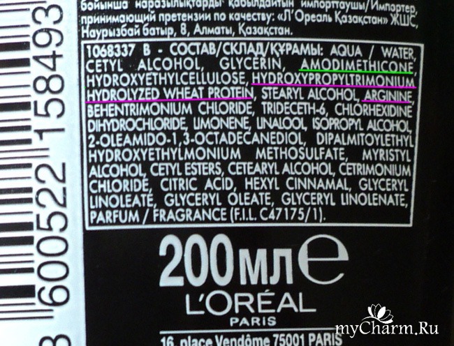 Это, наверное, самый интересный вопрос. И для вас, и для меня. Что обещает эта серия? Кстати, вы знаете, что у L’Oreal ещё есть серия «Сила Аргинина Light»? Поэтому есть смысл узнать об этом веществе, ведь сейчас в ассортименте сразу две гаммы с аргинином у L’Oreal. «Сила аргинина х3» - та, которую я тестирую. Она предназначена для нормальных волос. А «Сила Аргинина Light» имеет почти такие же упаковки, но голубой кантик со словом Light, и предназначена линия для жирных волос, так как формула в этих средствах более легкая, не утяжеляющая.Почему-то супермаркет, в котором я покупала средства, решил, что мне будет не очень интересно знать, что написано об Аргинине на упаковке: на всех упаковках были наклеены штрих-коды или наклейки от магазина.